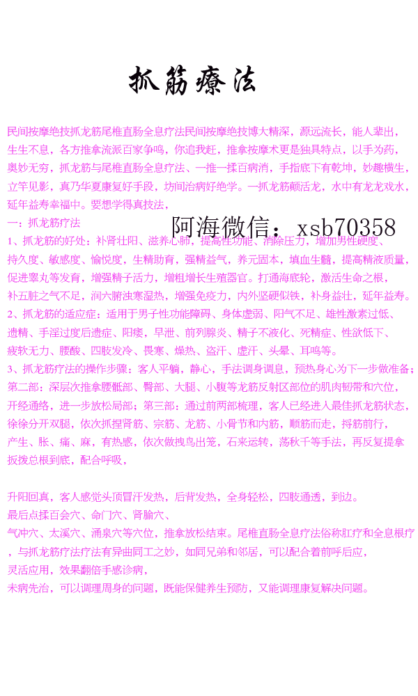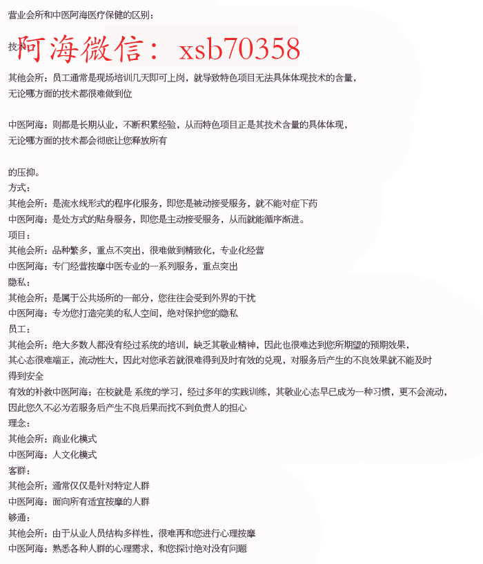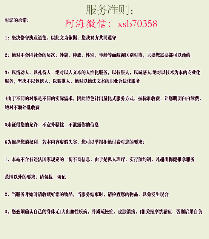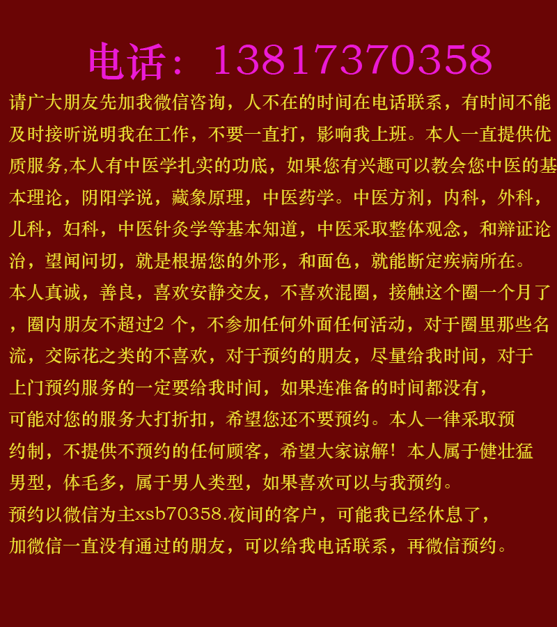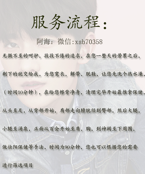 个人物简介;大家好,我叫阿海年龄30身高172体重69公斤 来自江苏,实力肌壮,本人出生中医世家,尽显男人的本色。本人中医学专业,中医基础理论,中医诊断,药学,方剂学,针灸学,内科,外科,妇科,儿科,西医诊断,西医内科学,传染病等是本人主修课程,现于临床保健项目,中医本来就是治未病,由于本人对于现在亚健康人群的关爱,决定献于健康保健项目,让更多人通过保健或者自身调理手段获得健康,是本人献于临床目标之一,本人身心健康,善于交流,热爱交友,是积极向上之人,本人学习中医专业给人的印象就是刻薄呆板,确实不然,本人喜欢交友,健身,游泳,拥有健美身型,喜欢学习,攻读法律题材,或者文学写作,如果您想结交这方面朋友,可以选择和我联系预约,本人是男人,成熟,稳重,多毛,健壮,猛男类型,本人喜欢服装,西服,西裤,领带,黑皮鞋,丝袜,性感内裤,商务化,现有西服几十套,不喜欢墨迹,唧唧歪歪,不诚信之人是我最讨厌的,在魔幻的大城市里,时间真是太宝贵了。本人由于时间的限制和诚信的原则遵守,本人一律实行预约制,预约套餐一,100,预约套餐二,200,预约套餐三,300.预约套餐四,400.不预约顾客一律不提供任何服务。本人正在读国学做人之道,人的每一次相遇都是缘分,前世今生化的缘,下一秒可能也是今生不可能相见,请珍惜在一起彼此短暂的时间。我的联系方式微信: QQ:2900625099